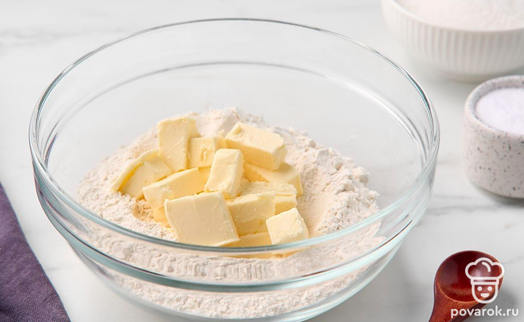 Насыпьте в миску муку. Нарежьте кубиками 90 г масла и положите в миску с мукой. Добавьте туда же соль и сахар. Перетрите все в крошку.