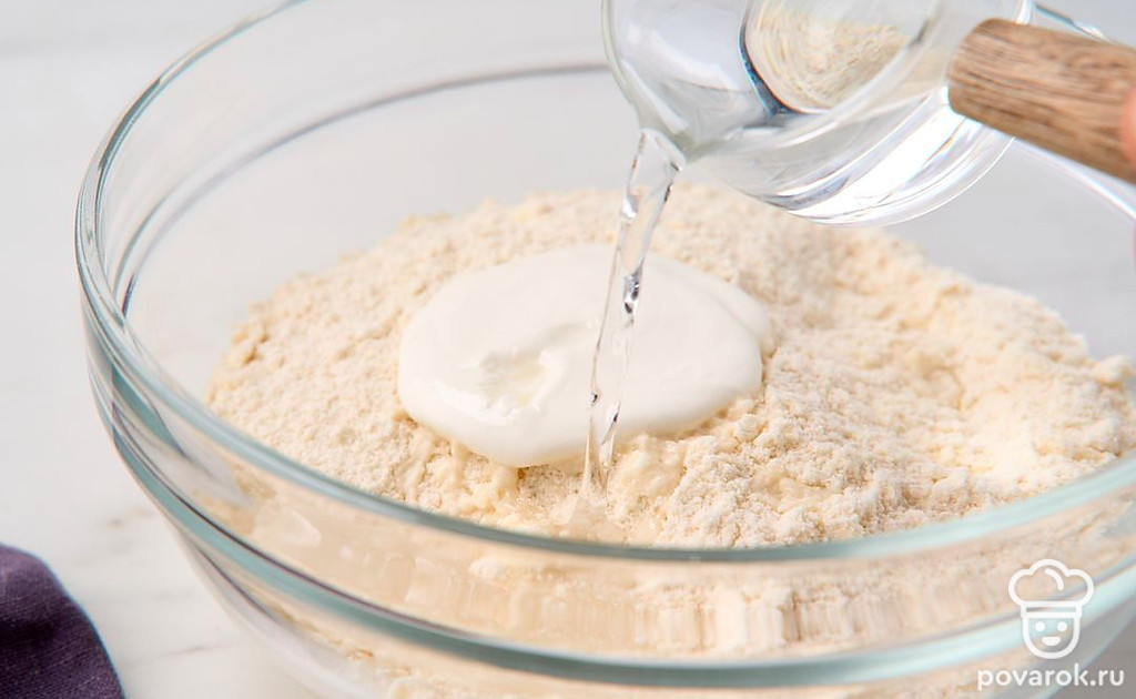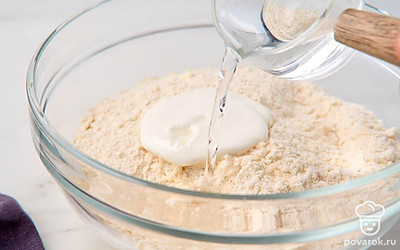 Добавьте сметану. Влейте холодную воду. Замесите однородное гладкое тесто.