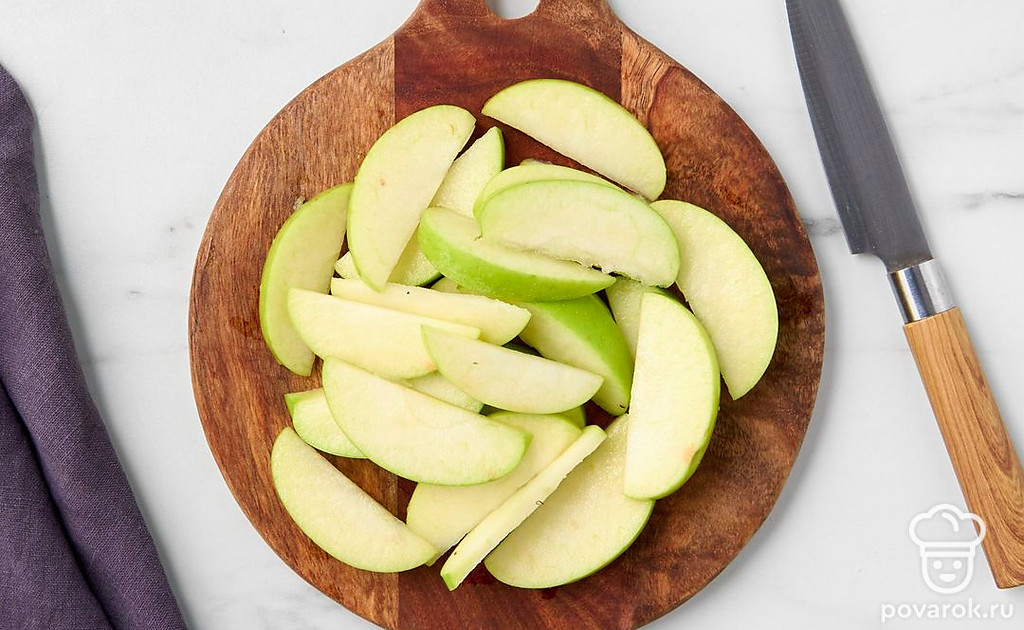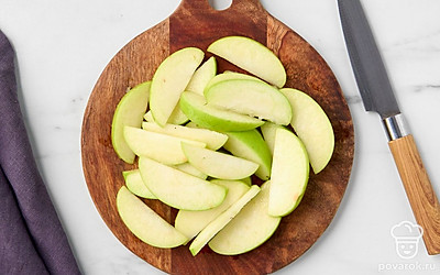 Разрежьте каждое яблоко на 8 долек. Вырежьте сердцевину.