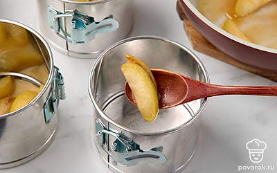 Разложите яблоки по формочкам. Равномерно залейте сиропом из сковороды.