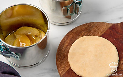 Разделите тесто на 4 части. Каждую часть раскатайте в небольшую лепешку по размеру формочек и накройте этой лепешкой яблоки. Поставьте формочки на противень и отправьте его в духовку, разогретую до 180 °C, на 25-30 минут. Дайте пирогам остыть в течение 20 минут. Накройте каждый пирог небольшой тарелкой или блюдцем и аккуратно переверните.