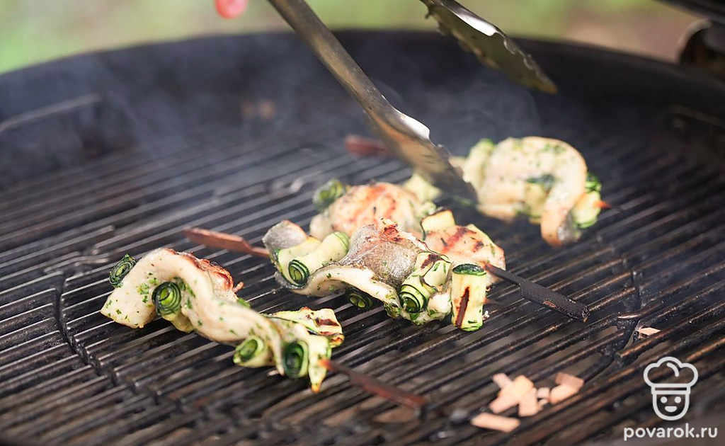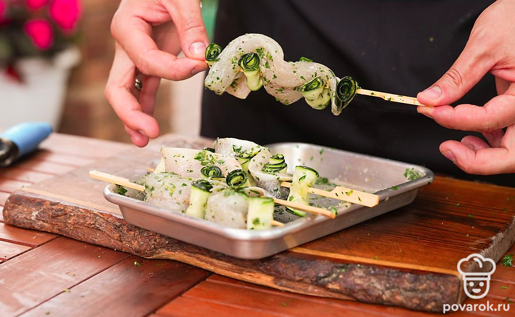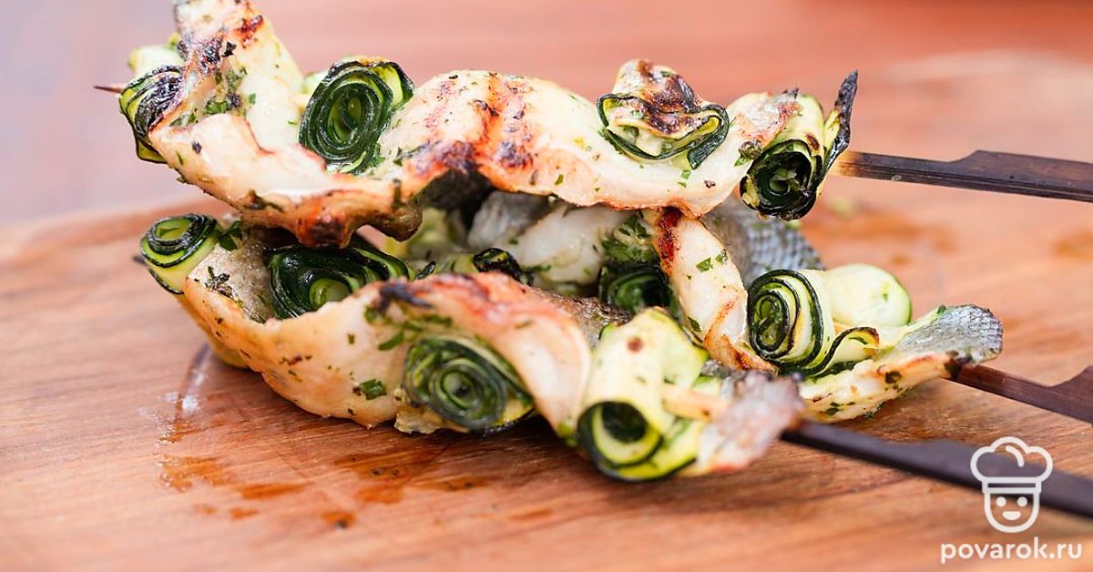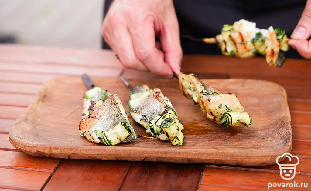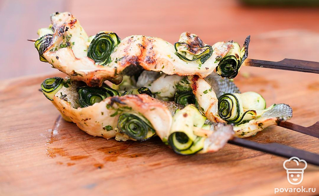 Небольшие шашлычки из рыбы на шпажках называются спидини. Чтобы блюдо получилось вкуснее и сочнее, добавим к сибасу рулетики из тонко нарезанного цукини. Овощи и филе маринуются в соусе из масла, чеснока, лимонной цедры и зелени, а затем насаживаются на шпажки и обжариваются на гриле. Получается аппетитная и хрустящая закуска.