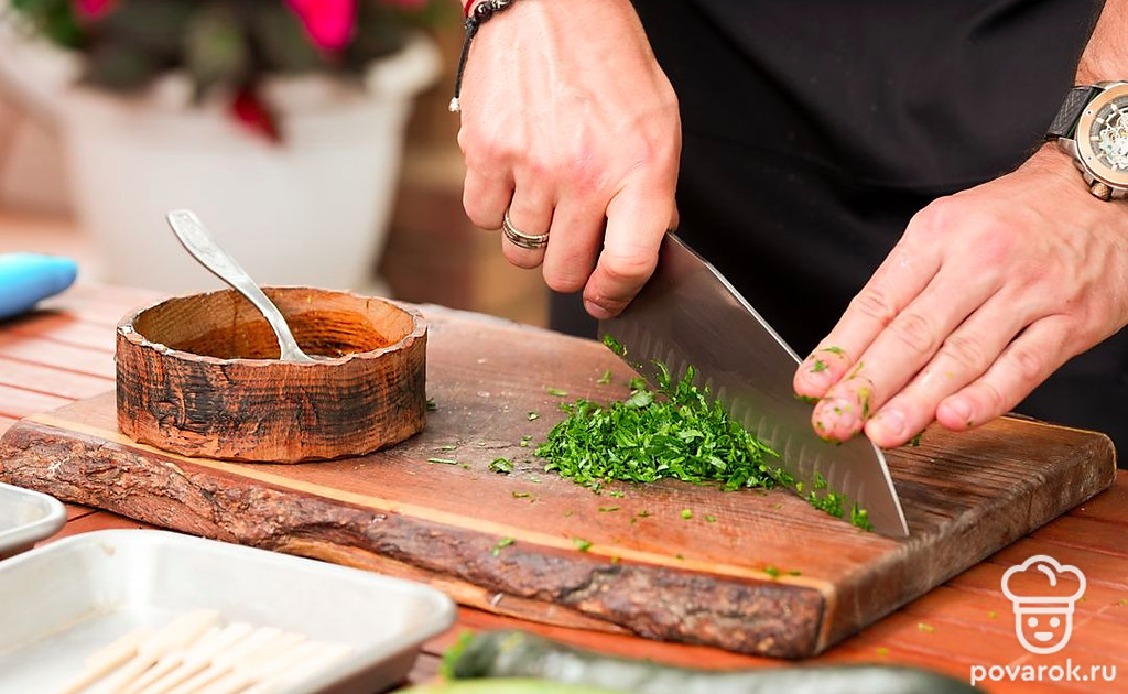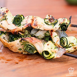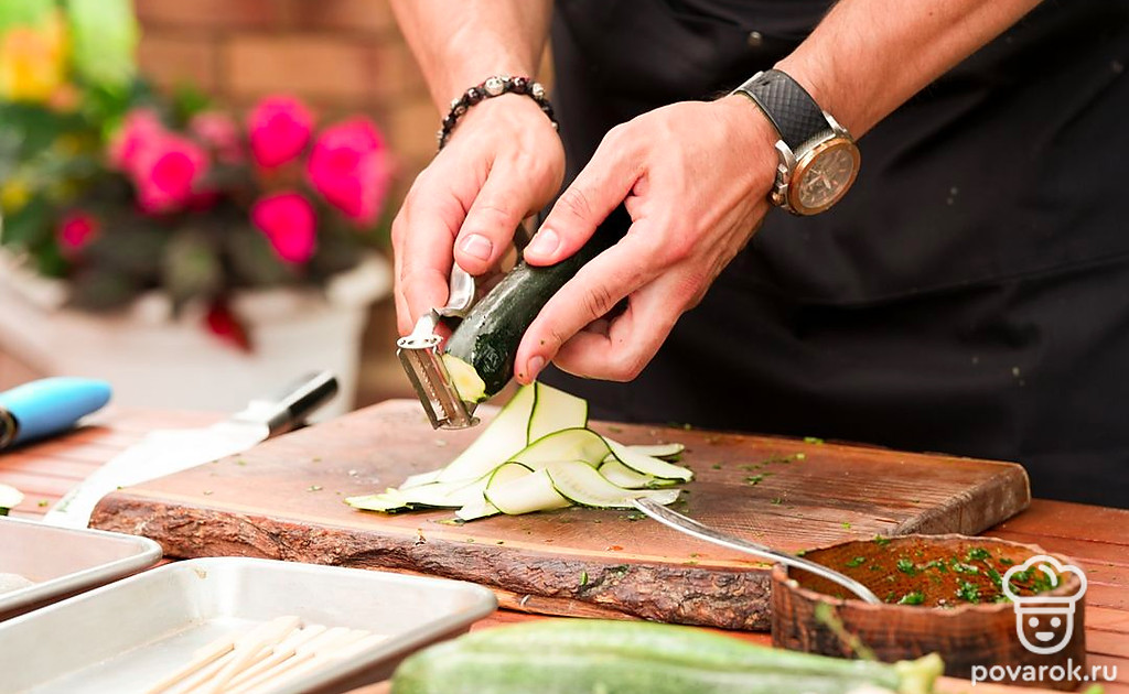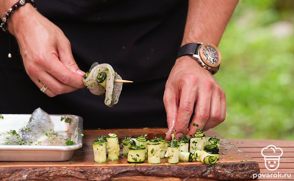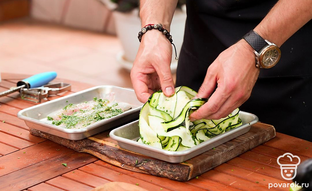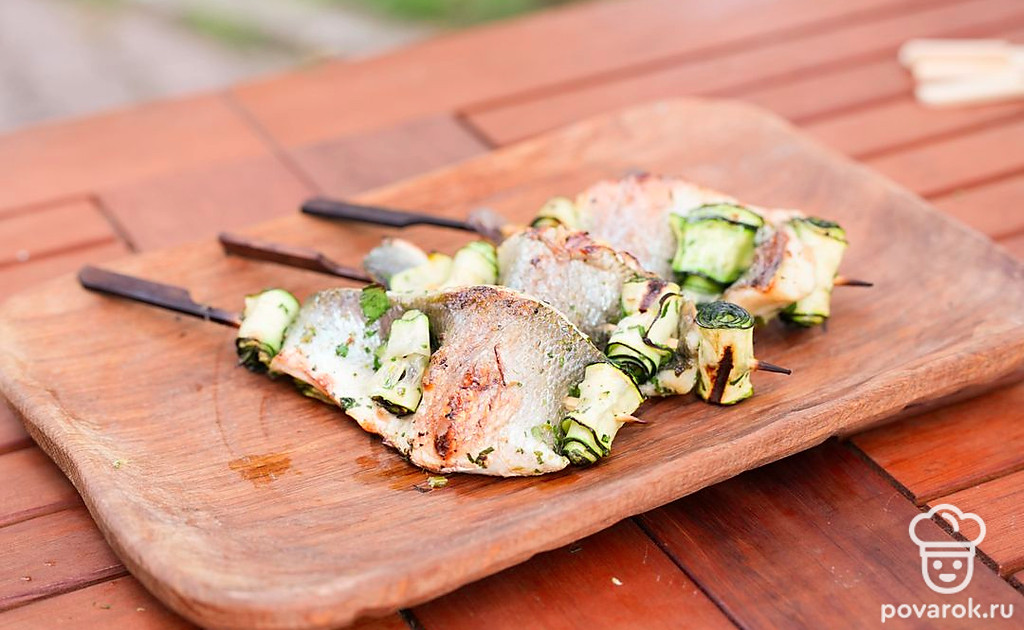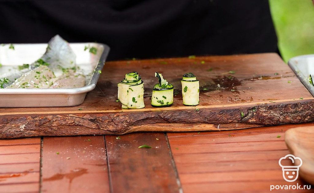 Небольшие шашлычки из рыбы на шпажках называются спидини. Чтобы блюдо получилось вкуснее и сочнее, добавим к сибасу рулетики из тонко нарезанного цукини. Овощи и филе маринуются в соусе из масла, чеснока, лимонной цедры и зелени, а затем насаживаются на шпажки и обжариваются на гриле. Получается аппетитная и хрустящая закуска.