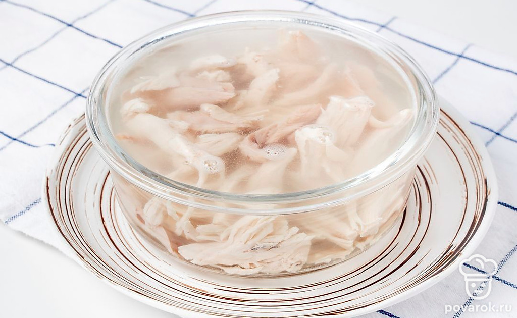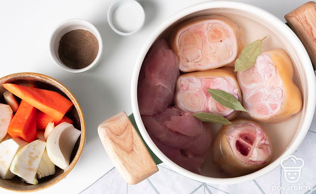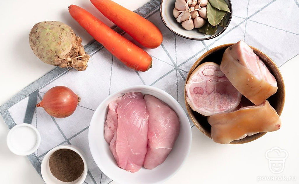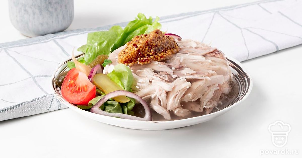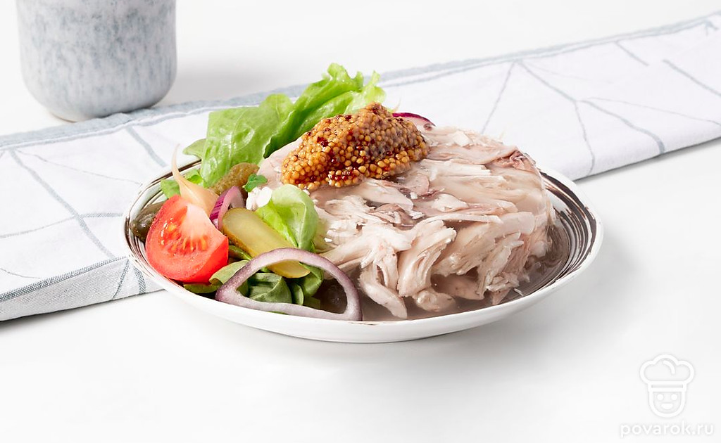 Холодец из филе индейки с говяжьими ногами — замечательное блюдо для любителей мясных закусок. Говяжьи ноги при варке выделяют вещество, которое позволяет блюду застыть и заменяет желатин. Бульон из мяса и овощей варится примерно 5 часов на слабом огне и после процеживается через сито. Чтобы добавить пикантность блюду, можно подавать холодец с хреном.