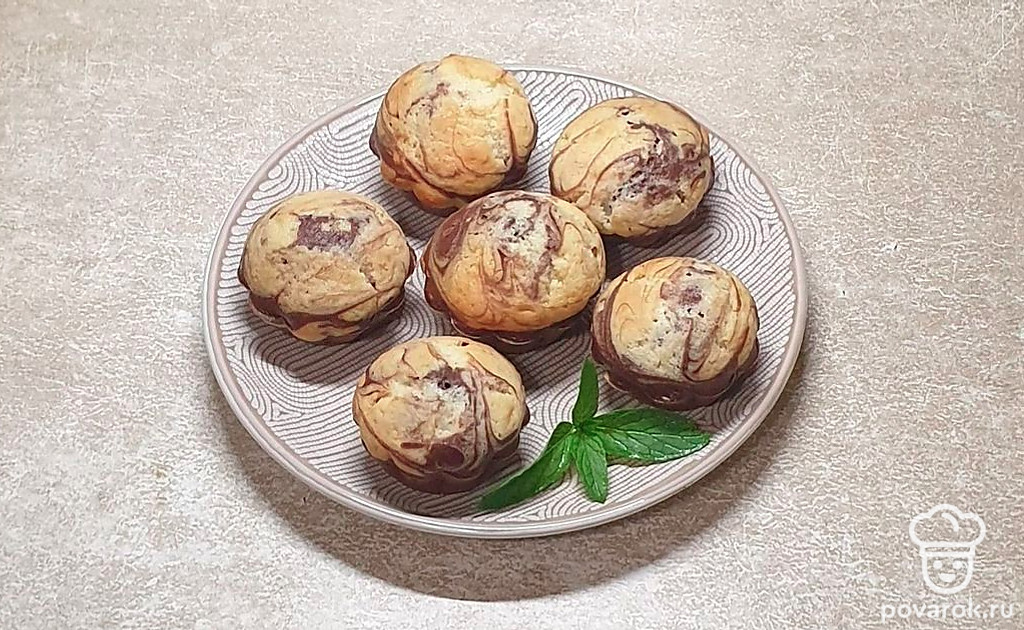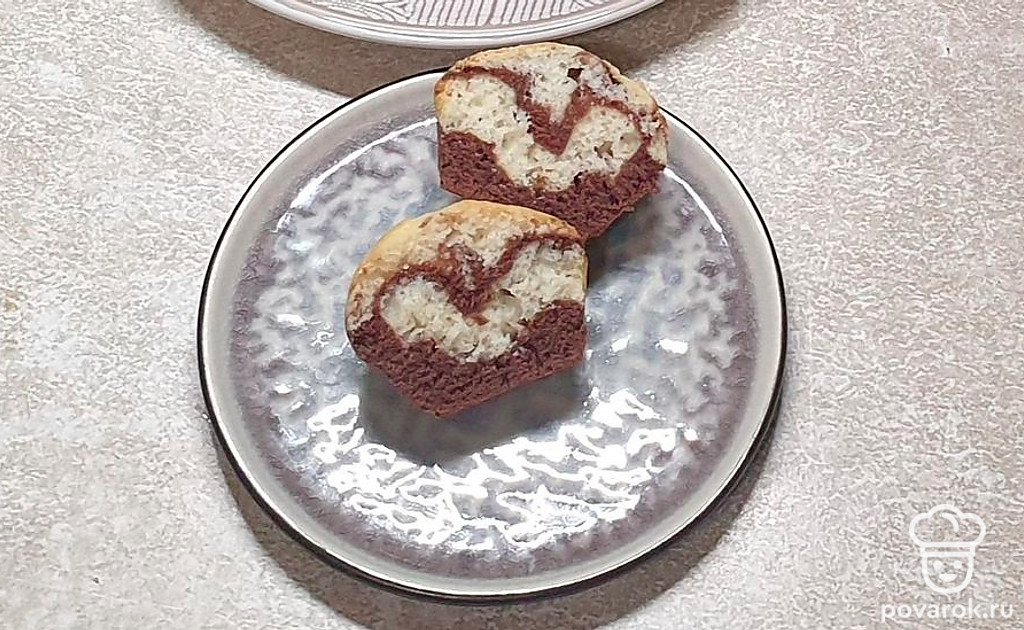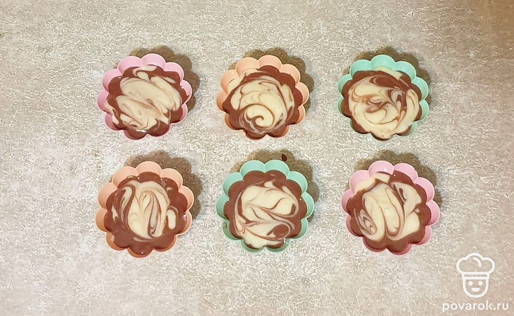 В подготовленные формочки для теста чайной ложкой по очереди вливайте тесто. Светлую часть теста, затем шоколадную и так слой за слоем. Сверху вилкой или зубочисткой можете сделать рисунок.