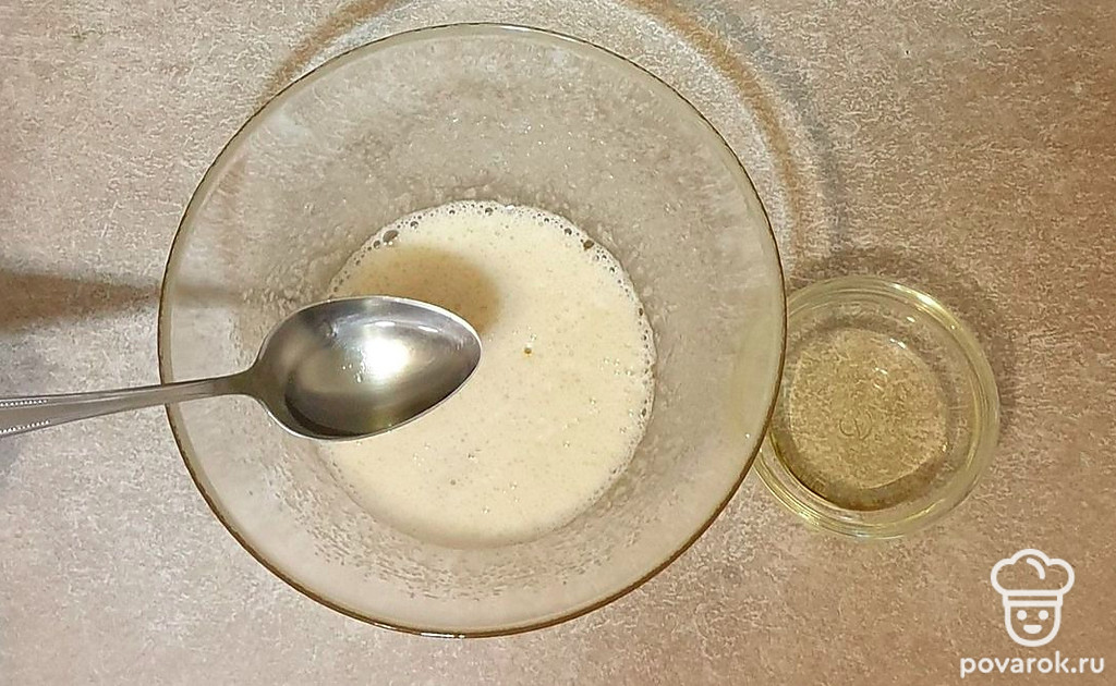 К яйцу и сахару влейте растительное масло без запаха, перемешайте.