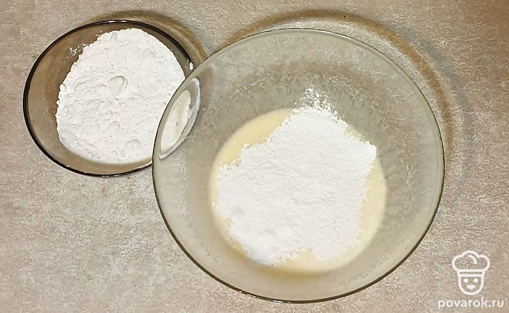 К муке всыпьте разрыхлитель и просейте в тесто. Вмешайте муку в тесто до однородности.