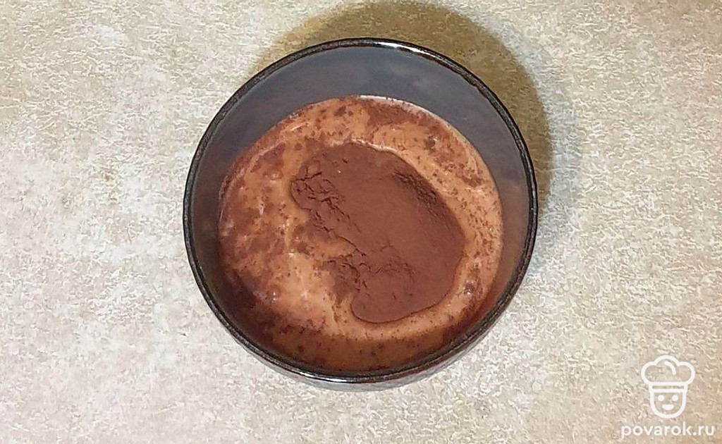 Тесто разделите на 2 равные части. Одну часть теста перелейте в отдельную миску. Добавьте какао и молоко, хорошо размешайте.