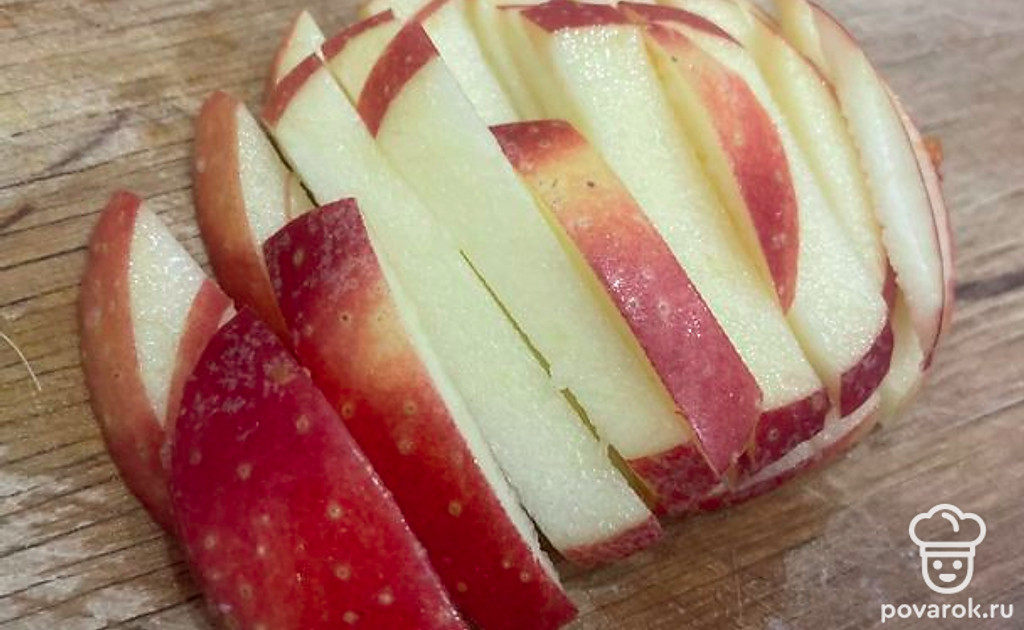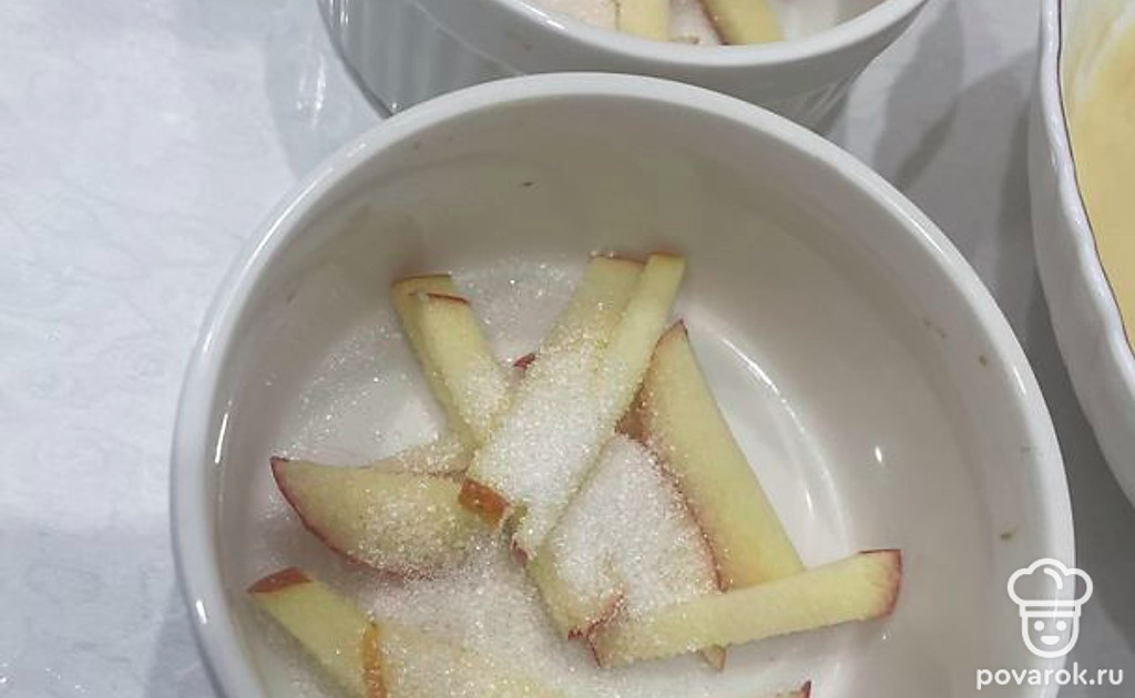 Разложите полоски яблока в формы, присыпьте фрукты сахаром.