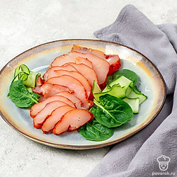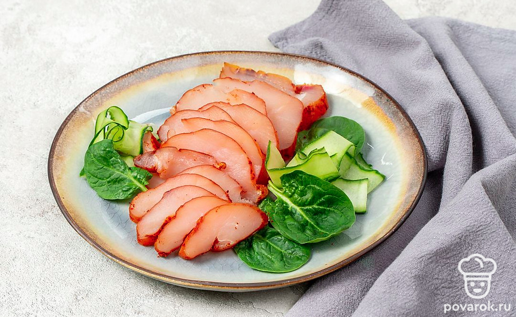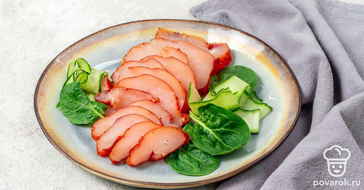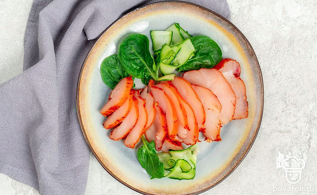 Нарежьте бастурму из куриной грудки на тонкие ломтики и подавайте мясную нарезку к столу. Бастурму можно добавлять в салат, омлет или сэндвичи.