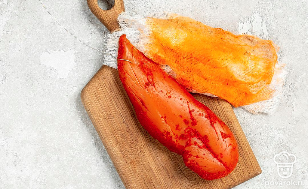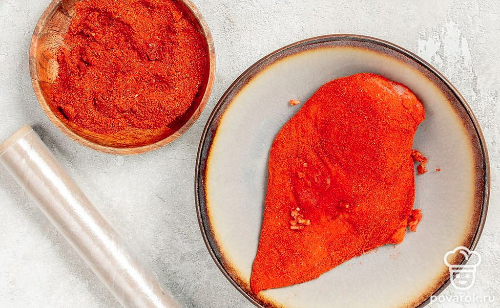 Бастурма — вяленое мясо конины, говядины или курицы, выдержанное под прессом. Говяжья бастурма готовится приблизительно 3 недели. Куриному деликатесу достаточно 6 дней для полного приготовления, ее вкус отдаленно напоминает вяленую рыбу. Для рецепта используйте свежее куриное филе. После окончания вяления держите бастурму завернутой в пищевую пленку в холодильнике. Так куриная бастурма полностью дозреет — благодаря распределению влаги в волокнах мяса текстура станет более эластичной.