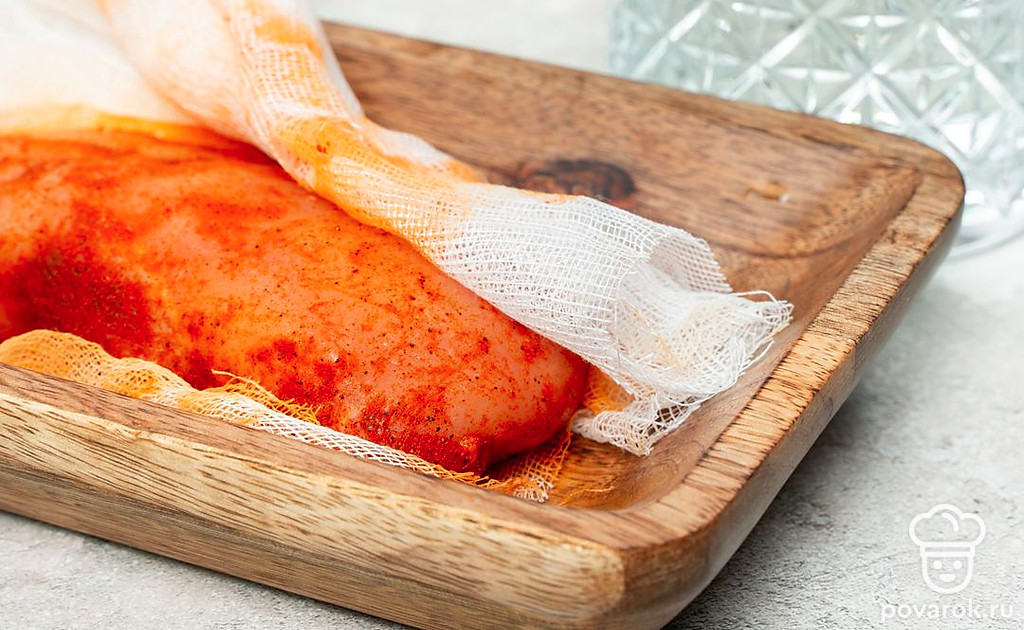 Высушите мясо под прессом. Куриное филе извлеките из сухого маринада и ополосните проточной водой. Заверните мясо в тонкую хлопковую ткань и положите в холодильник под пресс. Подойдет любой предмет подходящего размера — бутылка с водой, гиря и так далее. Держите мясо в холоде еще 24 часа. Когда ткань станет влажной, замените ее.
