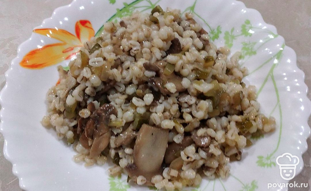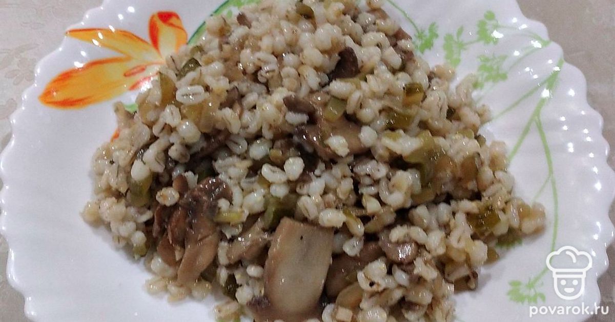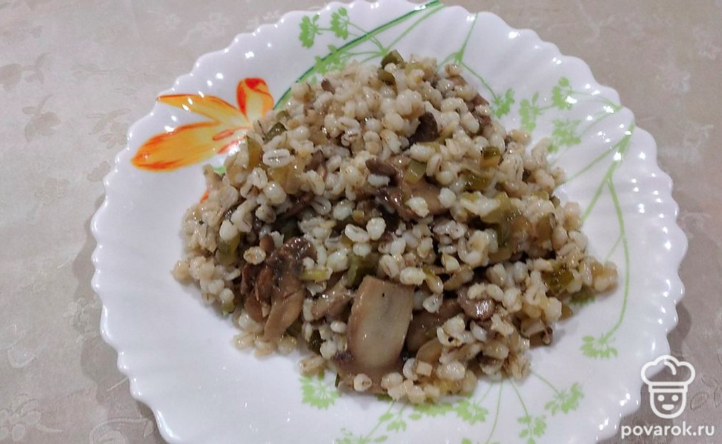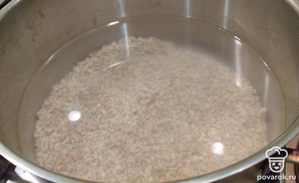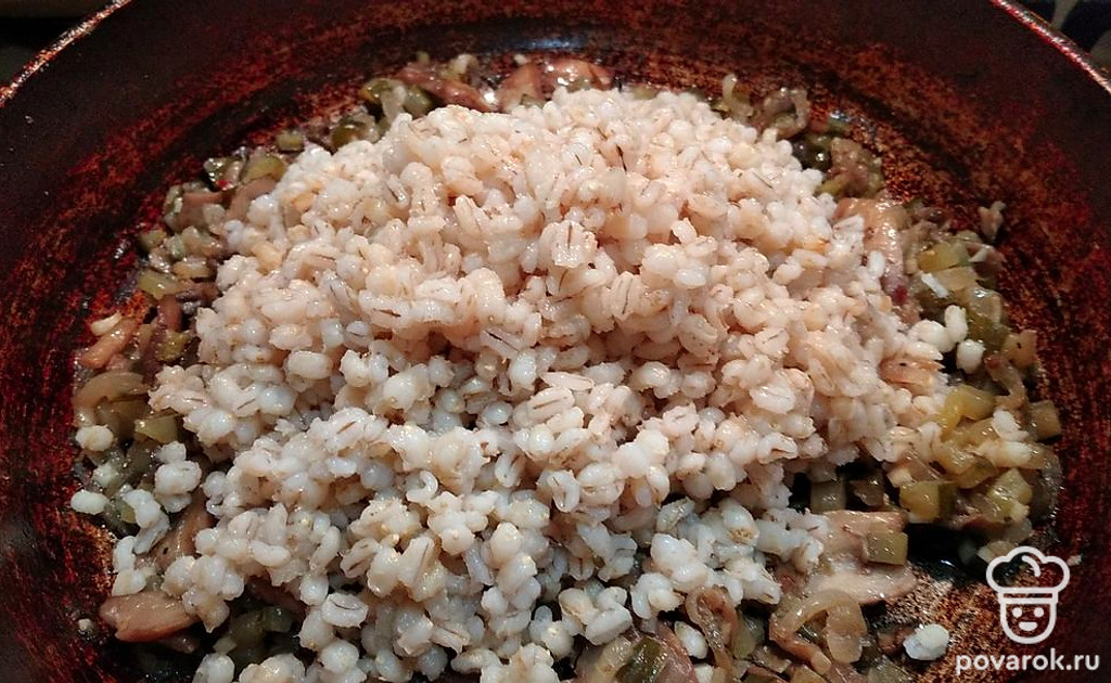 Выложите промытую перловку, перемешайте, тушите 3 минуты.
