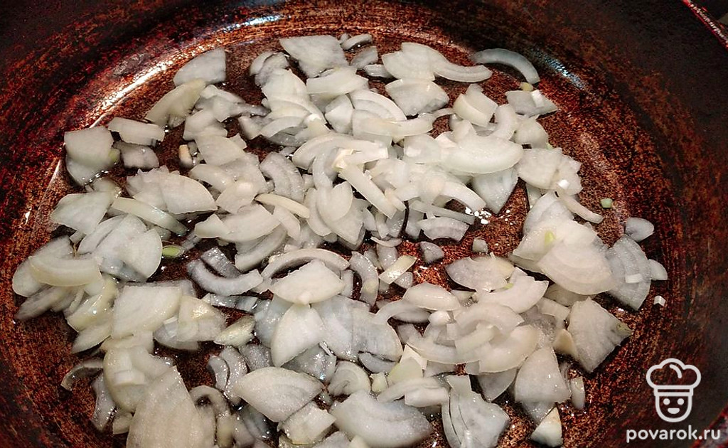 Обжарьте нарезанный лук на раскаленной сковороде с растительным маслом.