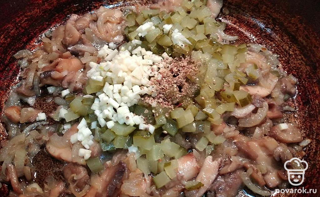 Добавьте нарезанные огурцы, чеснок, смесь перцев и перемешайте.