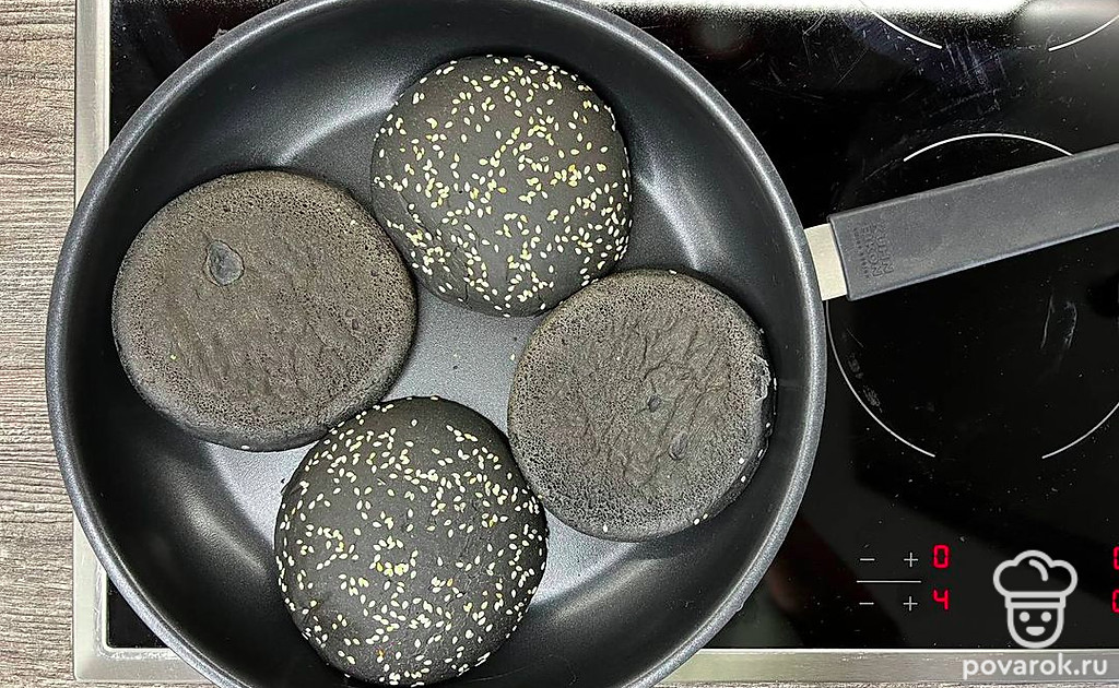 Смажьте булочки оливковым маслом со стороны срезов и обжарьте на разогретой сковороде на сильном огне 1 минуту, слегка прижимая рукой центр булочки. Снимите с огня, булочки переложите на доску, сковороду сохраните.