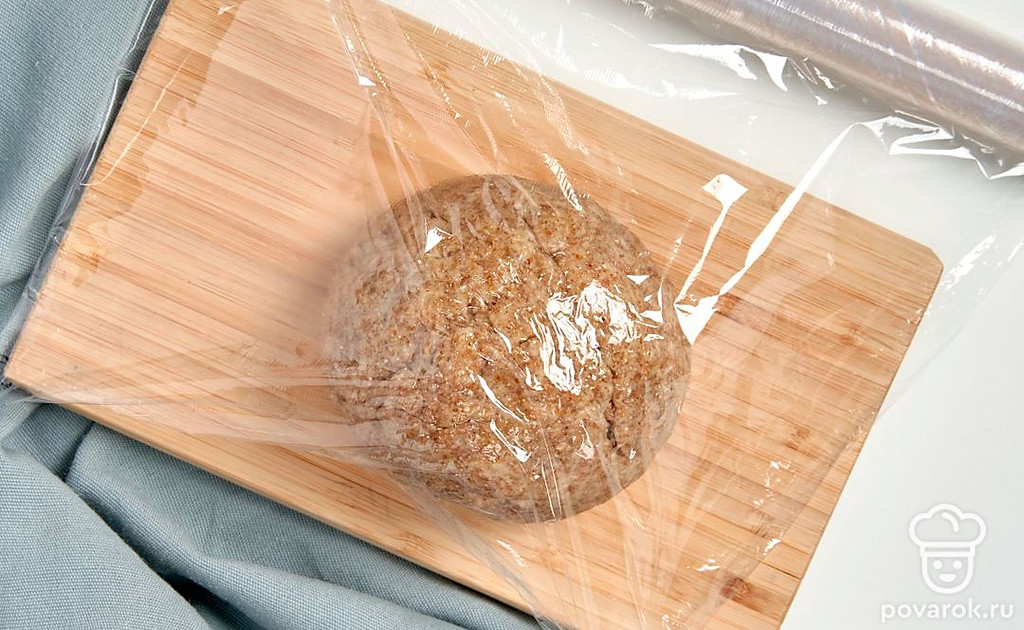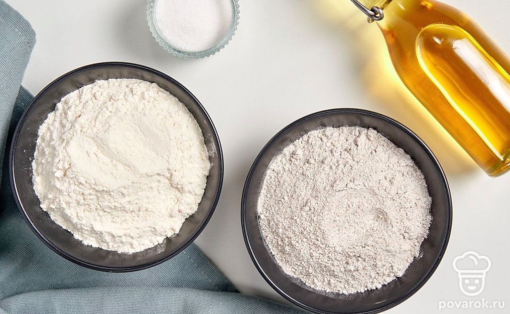 Просейте два вида муки. Разогрейте духовку до 200 градусов. Подготовьте противень, смажьте его оливковым маслом. Достаньте пищевую пленку и скалку.