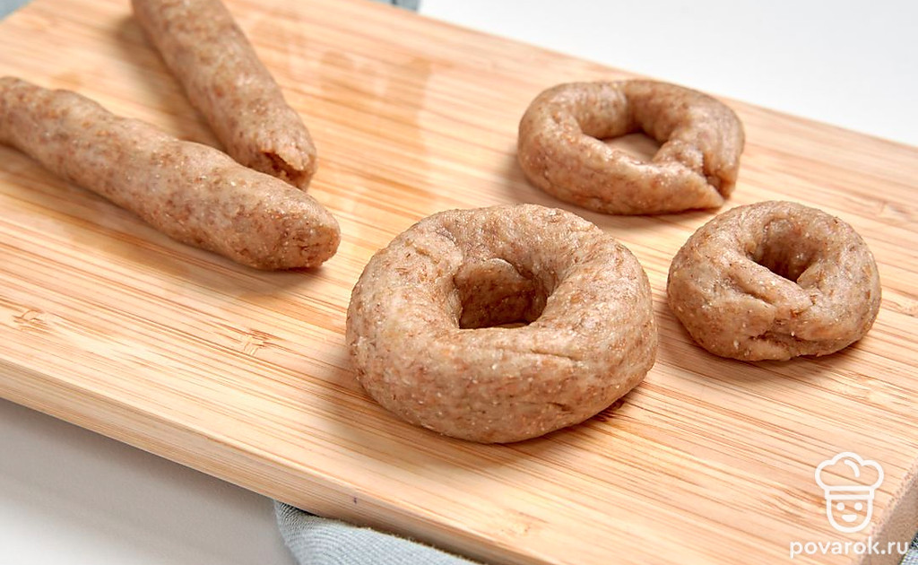 Приготовьте сушки. Из теста раскатайте колбаски в 1 см толщиной. Сформируйте из них сушки. В кастрюлю влейте воду, поместите ее на плиту, дождитесь кипения и положите в нее сушки. Дождитесь, пока изделия всплывут, и переложите их на дуршлаг. Разложите сушки на противень, поставьте их в духовку и выпекайте до румяного цвета около 20 минут.