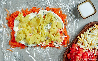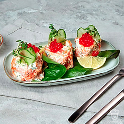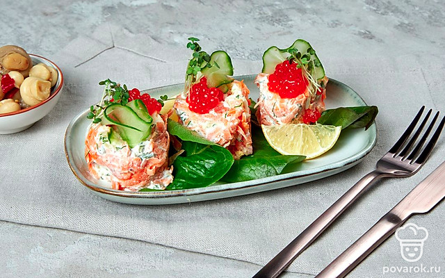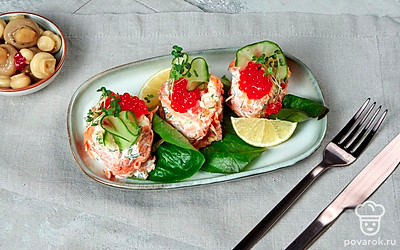 «Царский» салат в виде рулета с красной рыбой смотрится очень эффектно и достоин занять центральное место на праздничном столе. Готовить его совсем несложно — все ингредиенты выкладываются слоями на фольгу или пищевую пленку, а затем закручиваются в плотный рулет. Чтобы салат хорошо держал форму, перед подачей его нужно поместить в холодильник не меньше, чем на два часа. Украсьте готовый рулет красной икрой и нарежьте аккуратно на порции. Все присутствующие за столом будут в восторге.