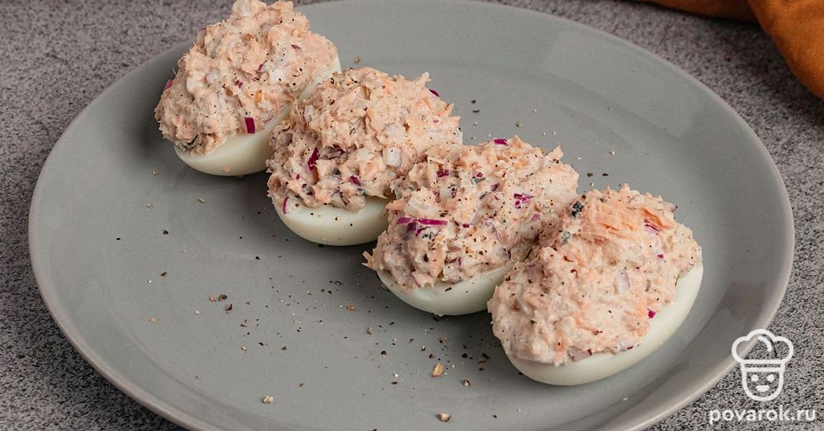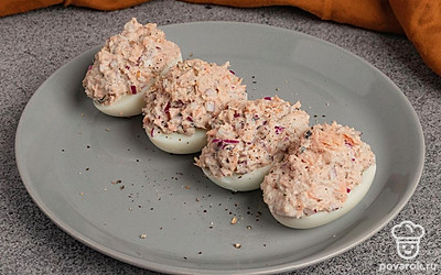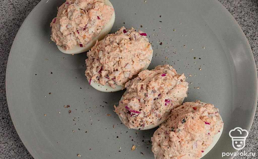 Готовые фаршированные яйца с горбушей и луком выложите на сервировочную тарелку и подавайте к столу.
