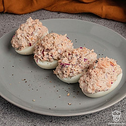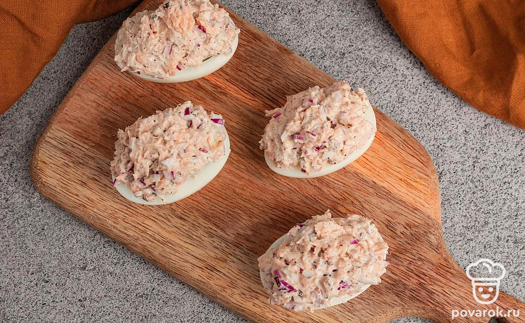 Дополнить меню праздничного застолья можно быстрой и вкусной закуской — яйцами, фаршированными с горбушей и луком. Это блюдо придется по вкусу всем гостям, особенно тем, кто любит рыбные консервы. Хозяйкам такие фаршированные яйца приносят отдельное удовольствие, так как не требуют много времени и сил на приготовление. С этой закуской смогут справиться даже дети. Несмотря на свой незамысловатый рецепт, фаршированные яйца смотрятся на столе эффектно и вкусно.