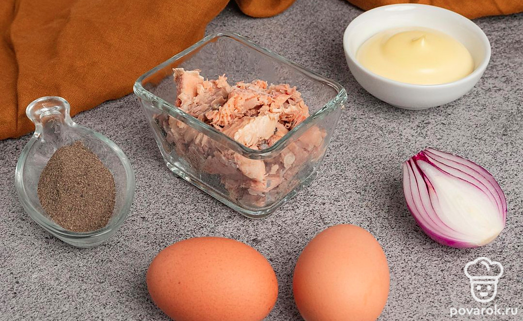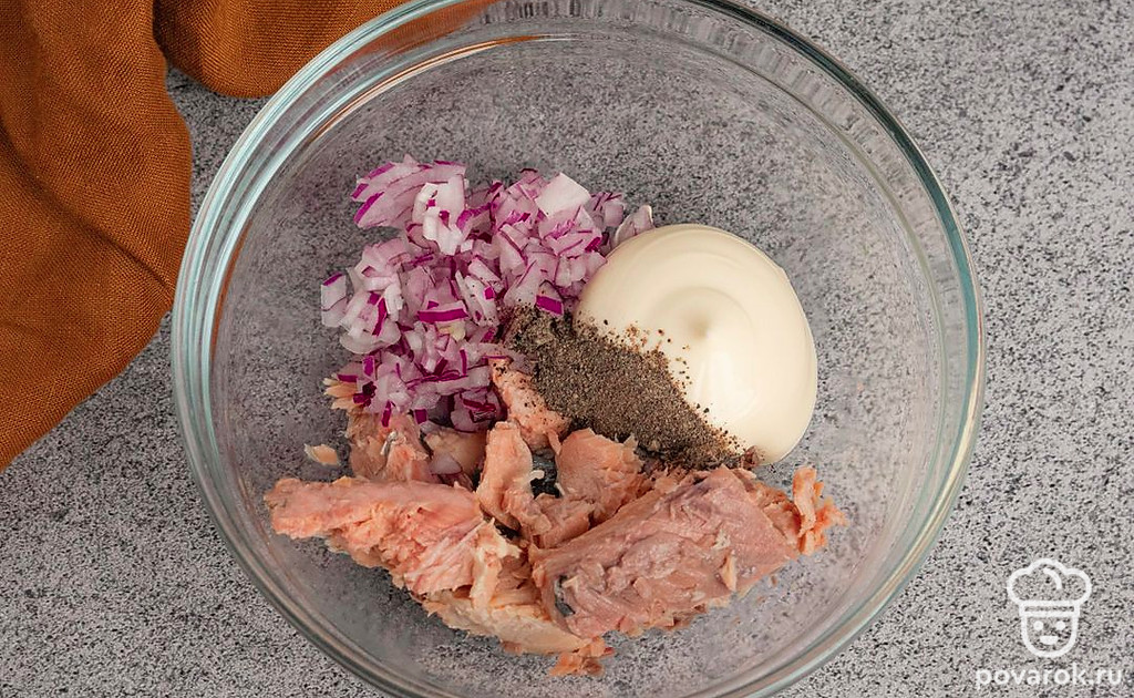 В глубокой тарелке смешайте горбушу, майонез, репчатый лук и перец.