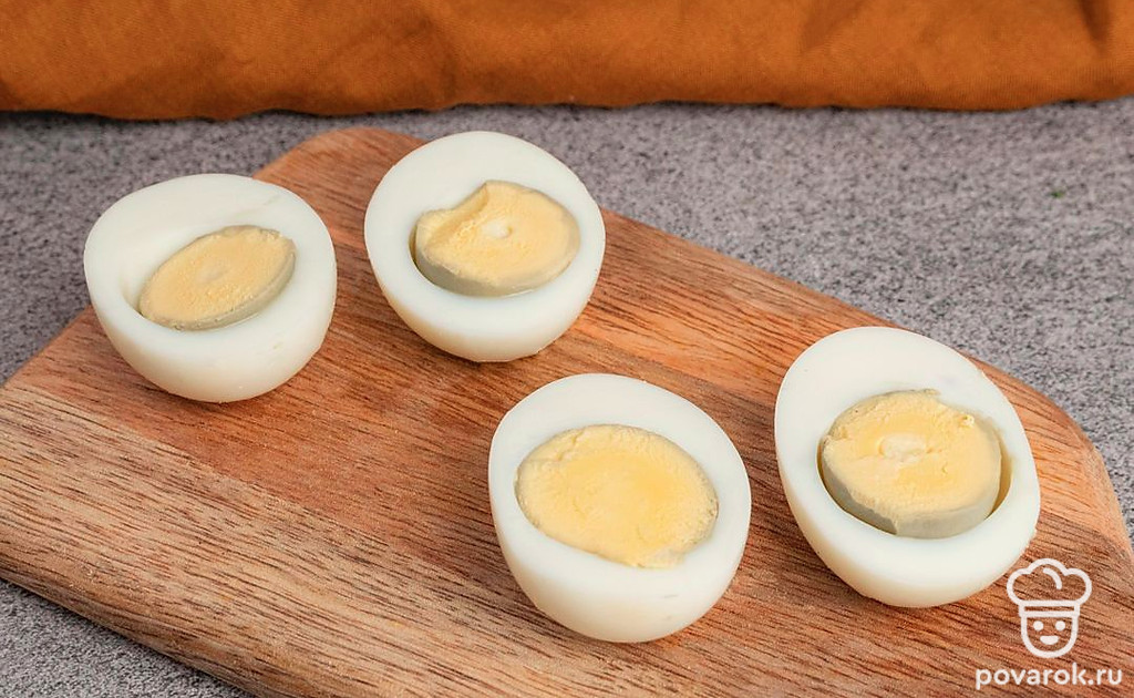 Яйца отварите вкрутую в течение 5-7 минут, почистите и разрежьте пополам.