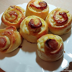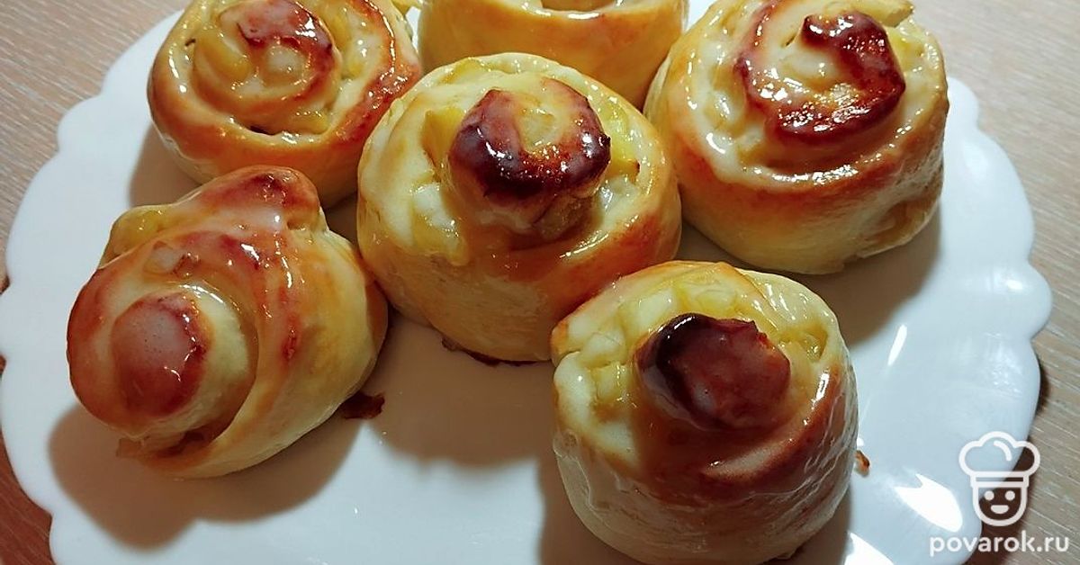 Тесто раскатайте тонко, выложите на него начинку. Сверните рулетом, швом вниз. Нарежьте. Заготовки переложите на противень, смажьте яйцом. Выпекайте при температуре 180 градусов минут 15. Затем томите при температуре 200 градусов до готовности.