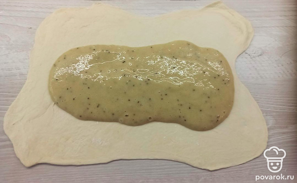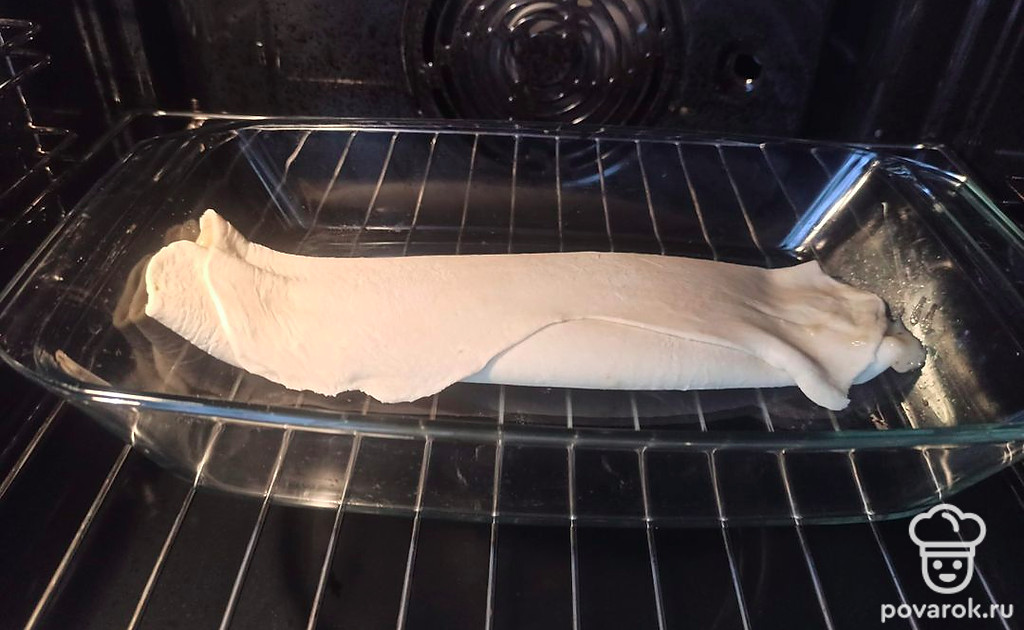 Выложите рулет на противень и поставьте в разогретую до 200 градусов духовку на 15 минут.
