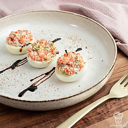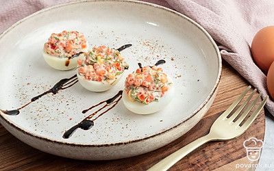 Полученную смесь выложите в готовые половинки яичного белка.