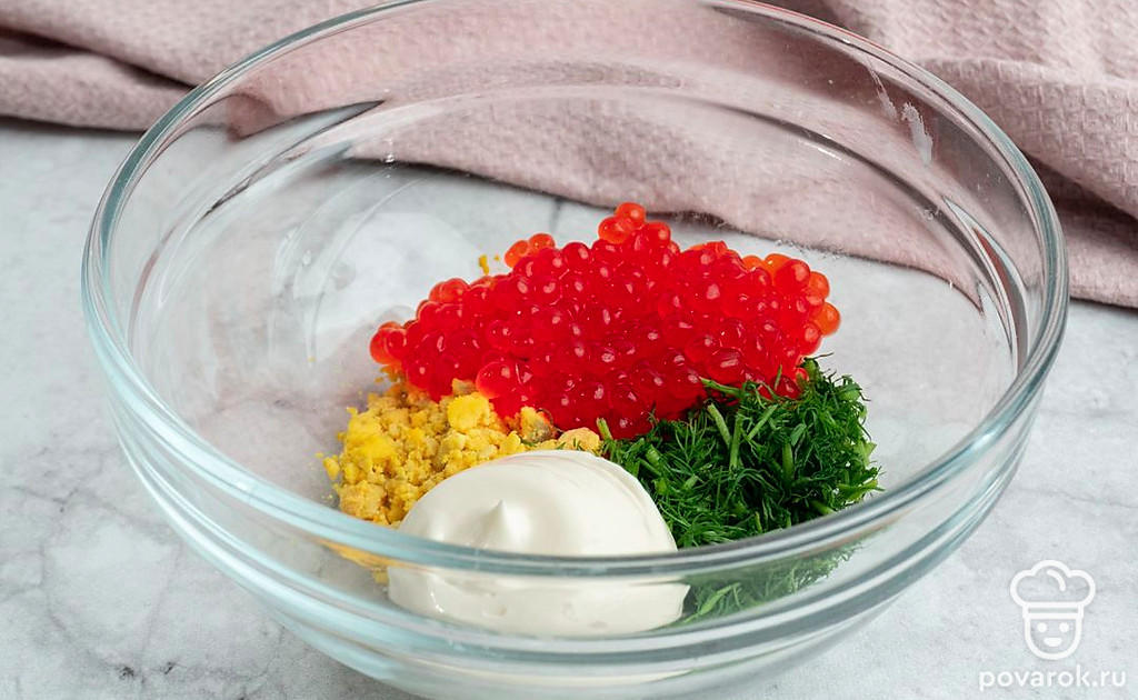 Вареные яйца очистите от скорлупы, разрежьте пополам и извлеките желтки. Натрите их на мелкой терке. В подходящую емкость выложите желтки, майонез, красную икру и измельченный укроп. Посолите на свой вкус, смешайте до однородности.