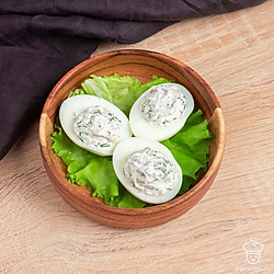 Чтобы закуска выглядела более празднично, а подача напоминала ресторанную, советуем выложить на тарелку для подачи листья салата, а уже на них положить фаршированные яйца. Ваши близкие и гости точно оценят ваши старания!