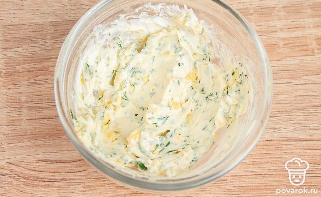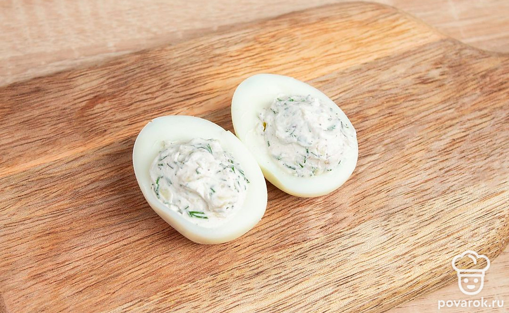 Возьмите белки и аккуратно, с помощью чайной ложечки, нафаршируйте их получившейся массой из сыра, укропа и желтков.