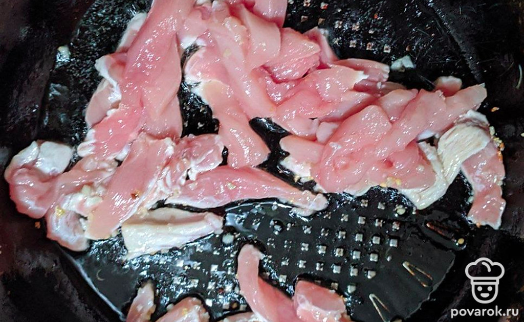 Куриное филе нарежьте длинной соломкой. Половину очищенного чеснока нарежьте мелкими кубиками. На разогретой сковороде в растительном масле обжарьте чеснок, и нарезанное куриное филе в течение 4 минут.