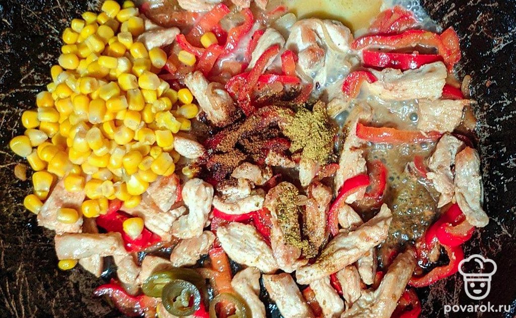 Налейте в сковороду кокосовое молоко, добавьте перец чили, консервированную кукурузу, специи и соль по вкусу. Перемешайте и тушите все ингредиенты в течение 6 минут. На листы лаваша, переложите готовую начинку, сверху выложите сметану и натрите сыр. Заверните лаваш плотным конвертом.