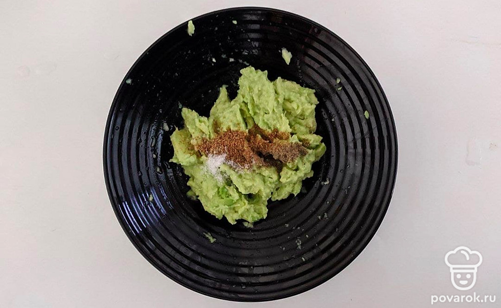 Авокадо нарежьте кусочками и сложите в удобную емкость. Добавьте к авокадо оставшийся чеснок и лимонный сок. С помощью блендера сделайте пюре, и добавьте кориандр, соль и черный молотый перец по вкусу. Перемешайте.