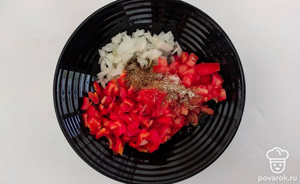 Помидоры, сладкий перец, и оставшуюся половину лука нарежьте мелкими кубиками. Соедините нарезанные ингредиенты в другой емкости. Добавьте соль и специи по вкусу. Перемешайте.
