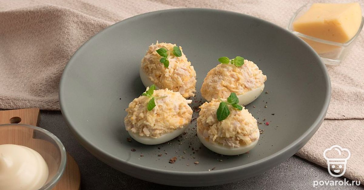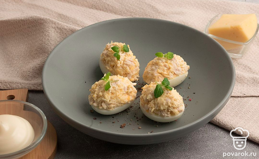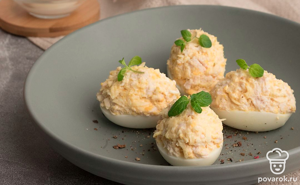 Яйца, фаршированные курицей и сыром, — аппетитная и очень вкусная закуска. Блюдо получается весьма изысканным несмотря на то, что готовится из самых простых ингредиентов. Для его приготовления вы можете взять филе куриной грудки или бедра. Сыр для блюда в рецепте используется твердый, но также можно добавить плавленый или сливочно-творожный, так получится еще вкуснее. Фаршированные яйца прекрасно подойдут для праздничного стола или фуршета.
