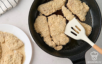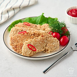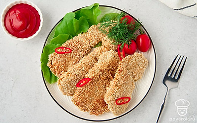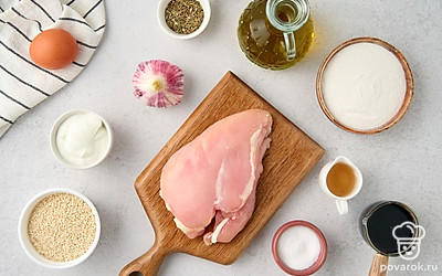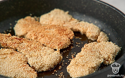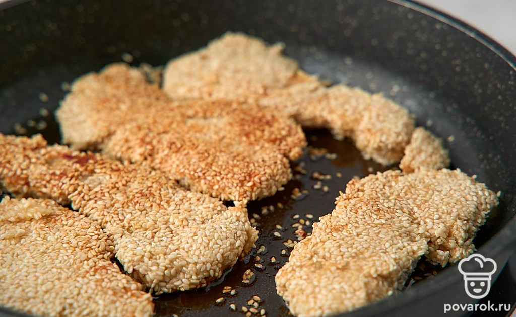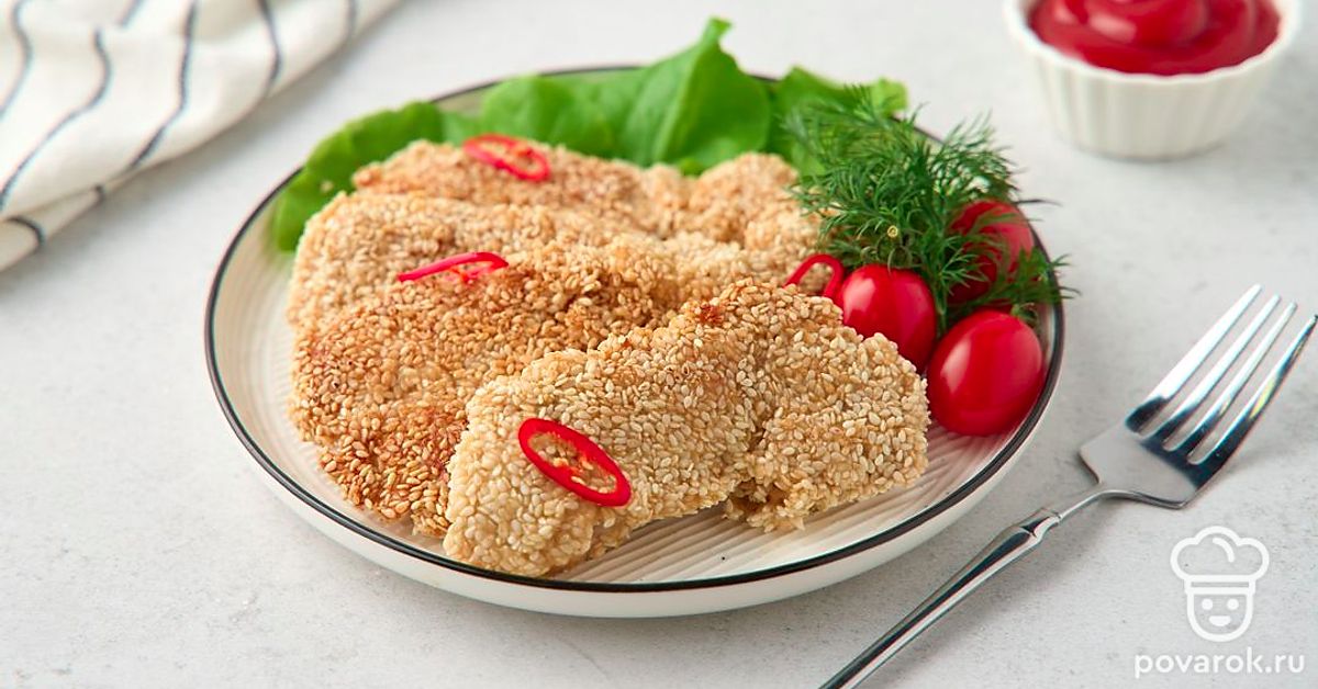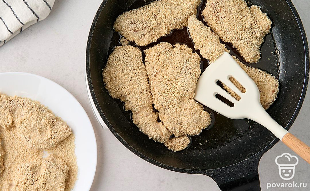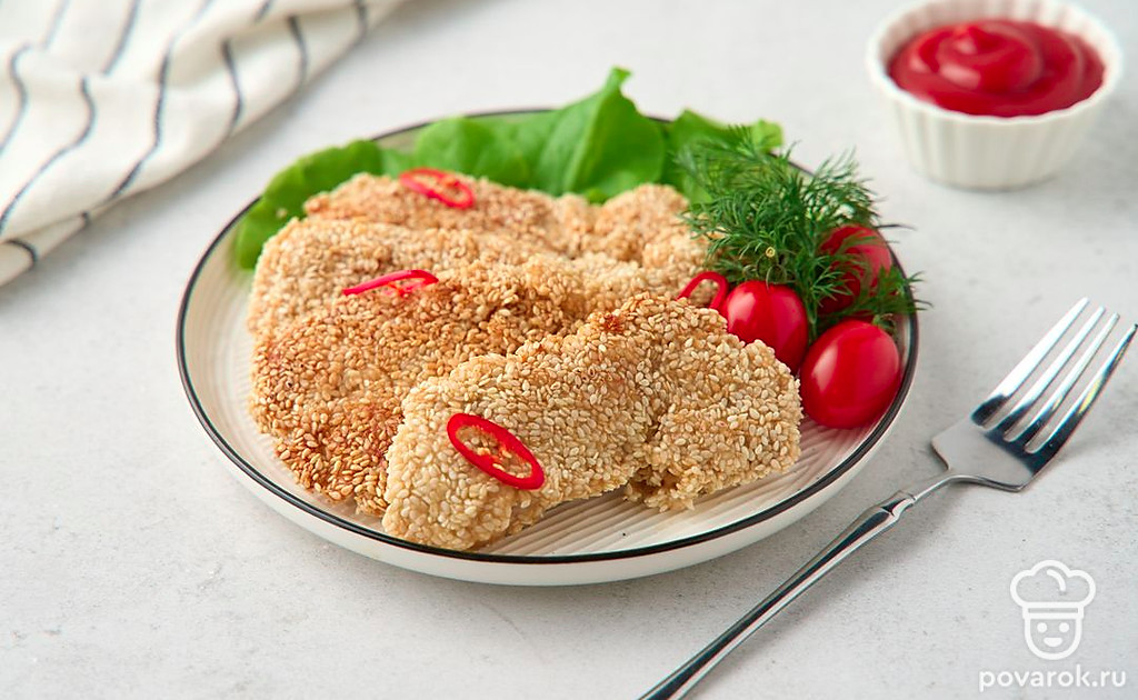 Курица в кунжутном кляре сочетает традиции европейской и азиатской кухни. В маринаде встречаются соевый соус и яблочный уксус, а в кляре — рисовая мука, йогурт и сушеные итальянские травы. Всего через 30 минут маринования курица готова к обжарке. Кляр с кунжутом становится золотистым в горячем масле, а внутри остается мягким и плотно «запечатывает» соки курицы с приправами.