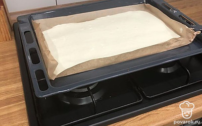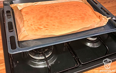 Взбить 3 белка с сахаром до густой пены, добавить желтки и муку, замесить бисквитное тесто, разровнять на пергаментной бумаге.