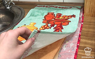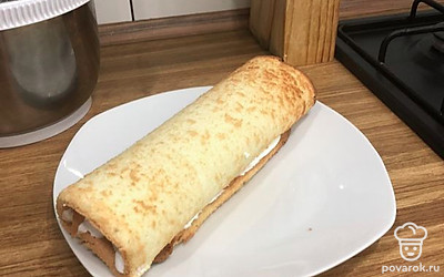 Выложить бисквит на полотенце и свернуть в рулет, оставить до полного остывания.
