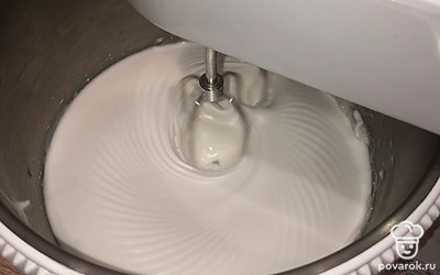 Взбить белки до густой пены, добавить сахарный сироп (воду с сахаром 1:2,5 уварить в ковше до состояния плотного шарика), взбивать до полного остывания крема.