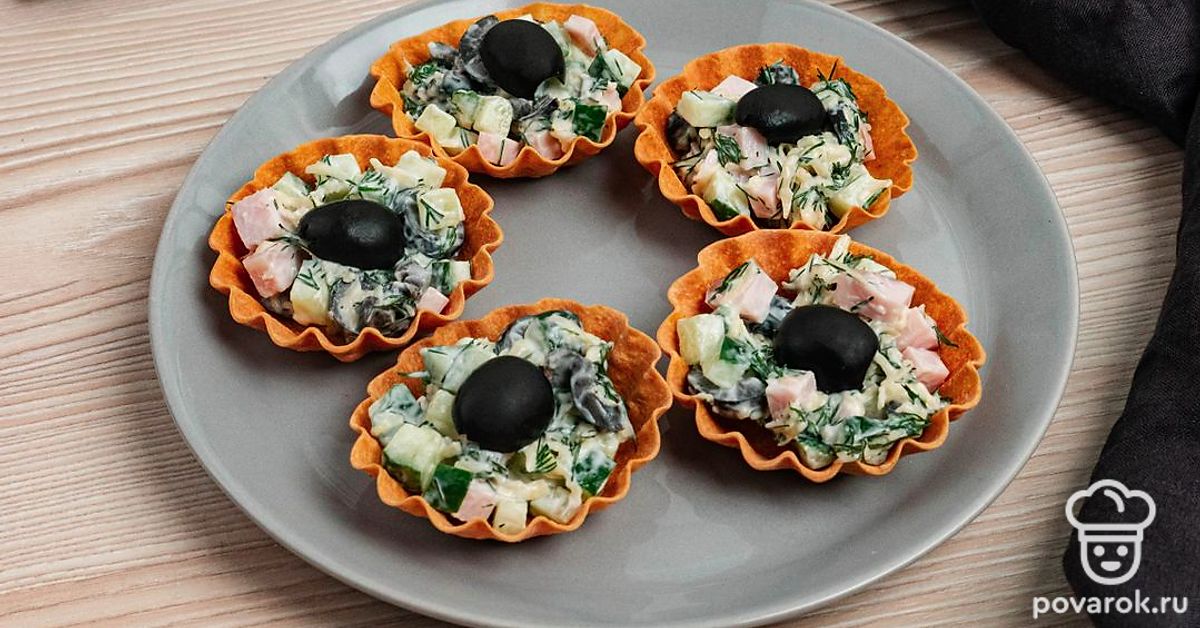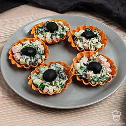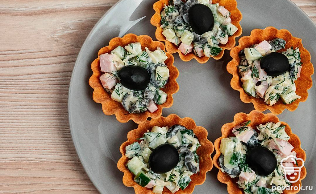 Тарталетки — это небольшие корзиночки из теста, которые можно заполнить абсолютно любой начинкой, главное, чтобы ингредиенты сочетались и дополняли друг друга. Они эстетично выглядят, а значит хорошо впишутся на праздничный стол. Сэкономьте себе время выбрав уже готовые тарталетки. Останется нарезать овощи, зелень и карбонад, добавить тертого сыра и кусочки маслин и разложить закуску по корзинкам. Хрустящая основа и нежная начинка внутри, чтобы разбудить рецепторы перед основными блюдами.
