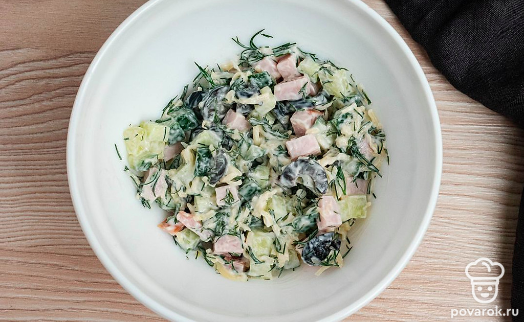 Подготовьте необходимые ингредиенты. Маслины лучше выбрать без косточки, это сэкономит вам время. Помойте овощи и зелень. Карбонад нарежьте кубиком.