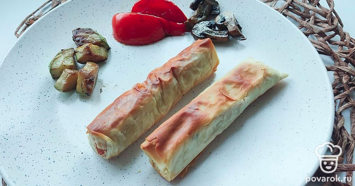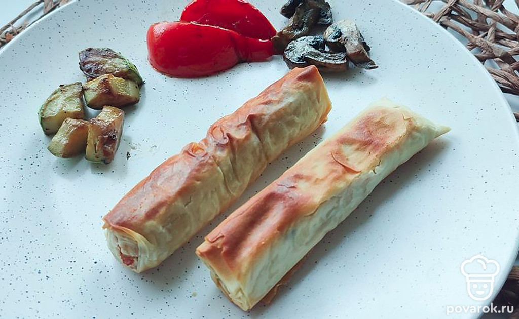 Добавить грибы, которые отдельно обжарили, и твёрдый сыр, порезанный кубиком. Посолить и поперчить. Начинку выложить на пласт теста, смазанного маслом. Завернуть рулетик. Сложить в форму для запекания. Сверху хорошо смазать маслом. Выпекать 35 минут до румяного цвета при 180 градусах. Сверху периодически смазывать маслом.