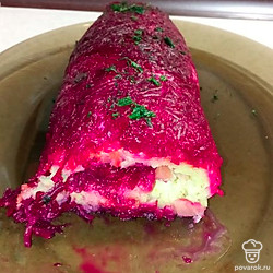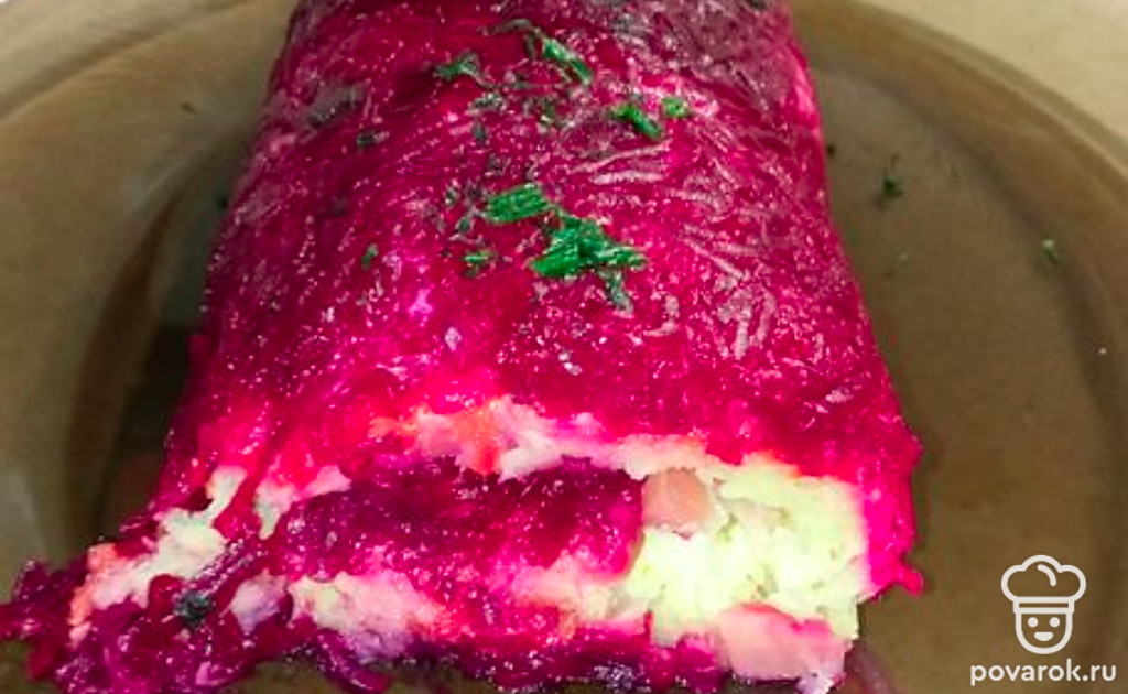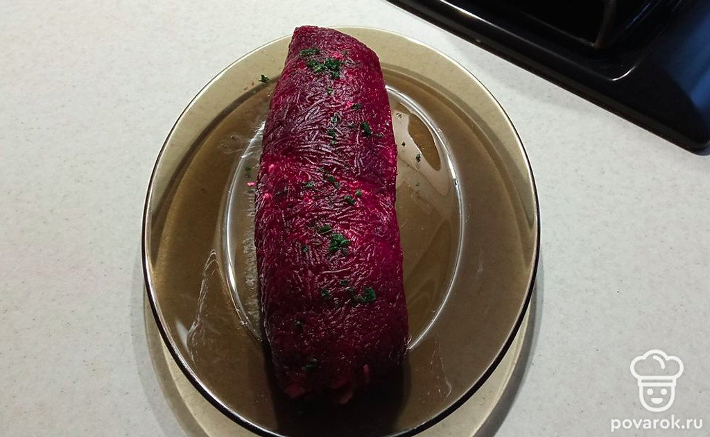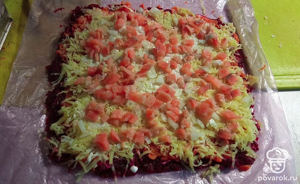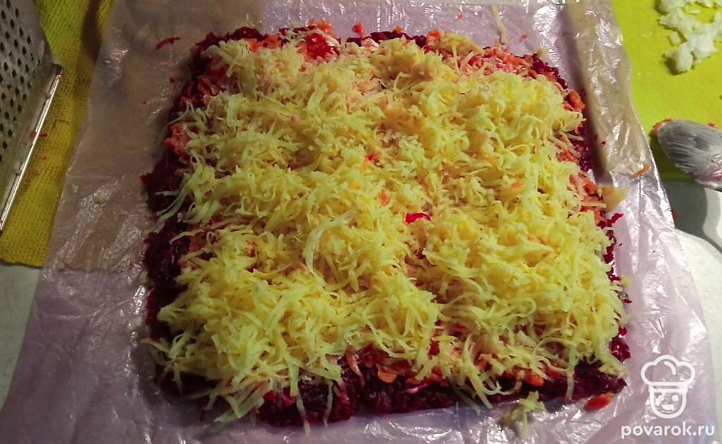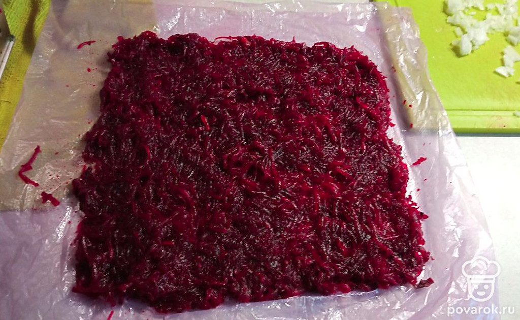 Отварную свеклу натираем на терке. На пищевую пленку выкладываем в виде прямоугольника. Смазываем майонезом.