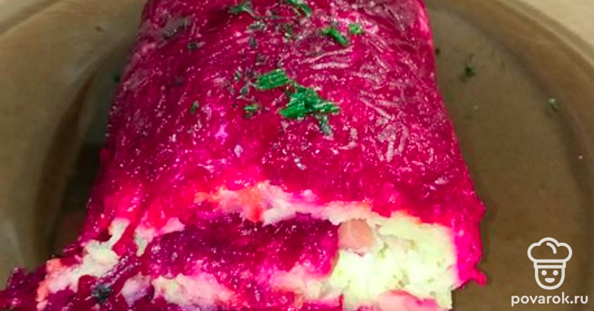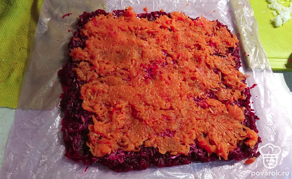 Отварную морковь натираем и выкладываем на свеклу. Приправляем майонезом.