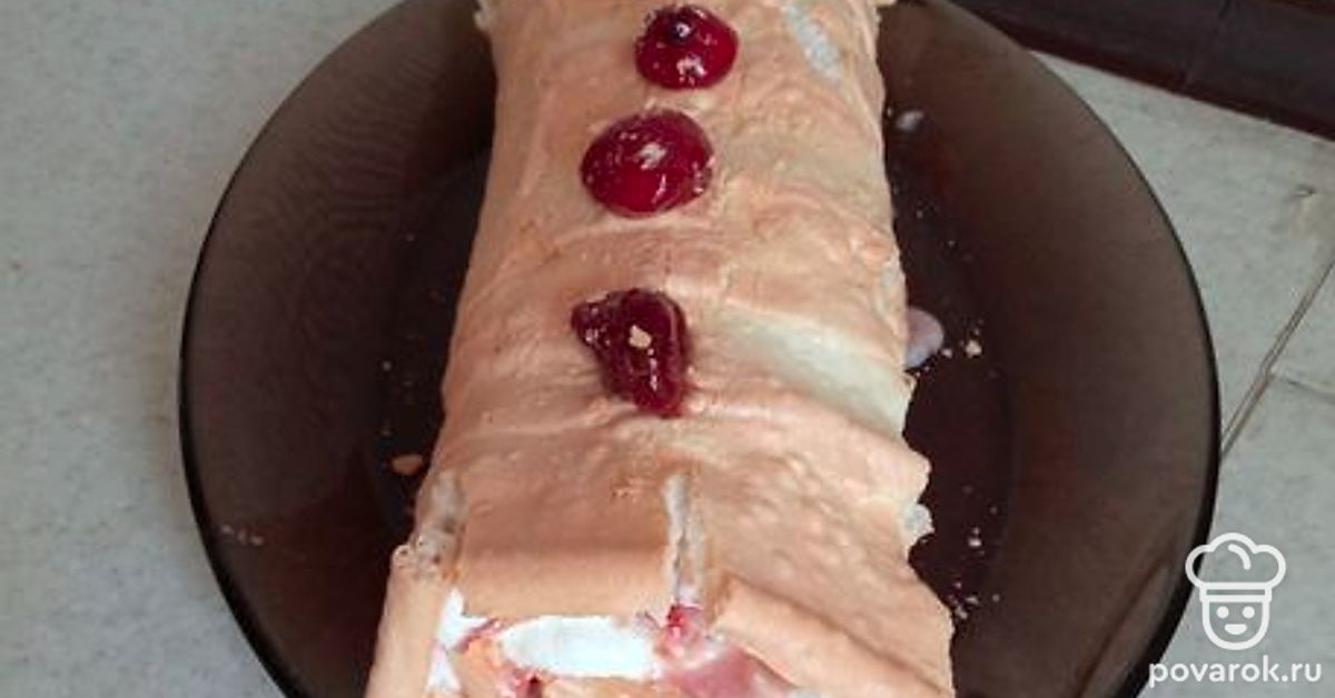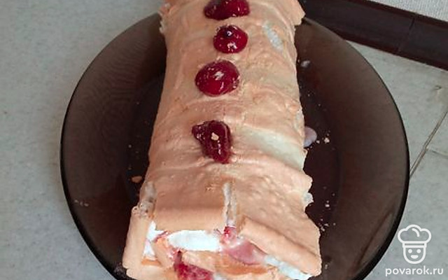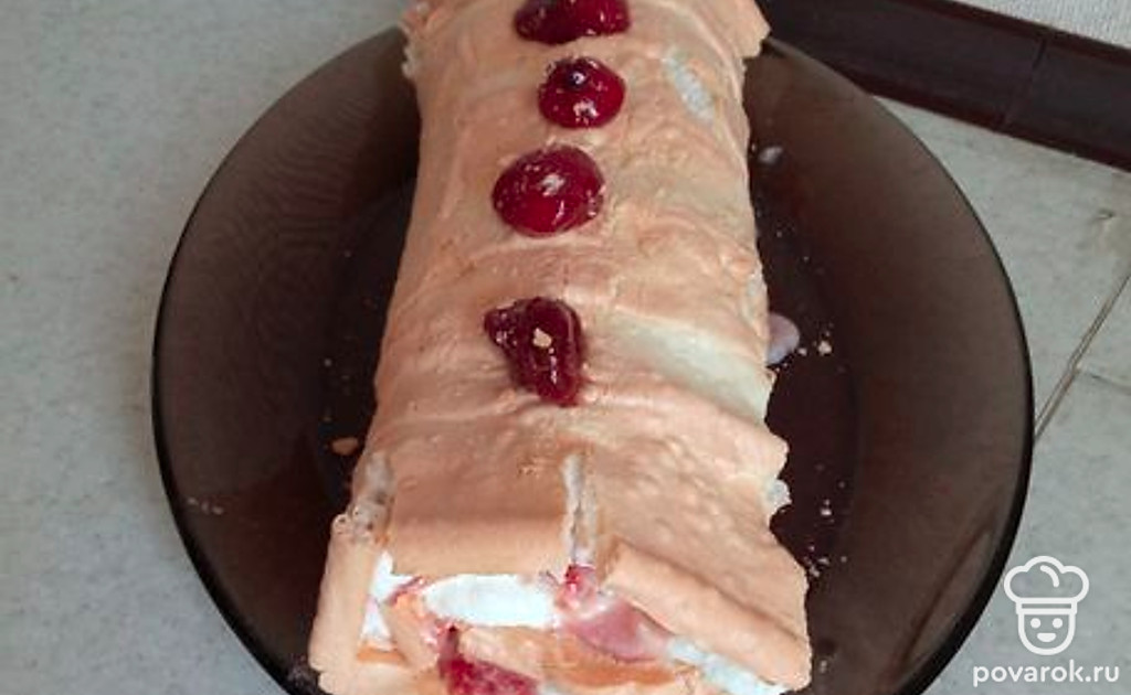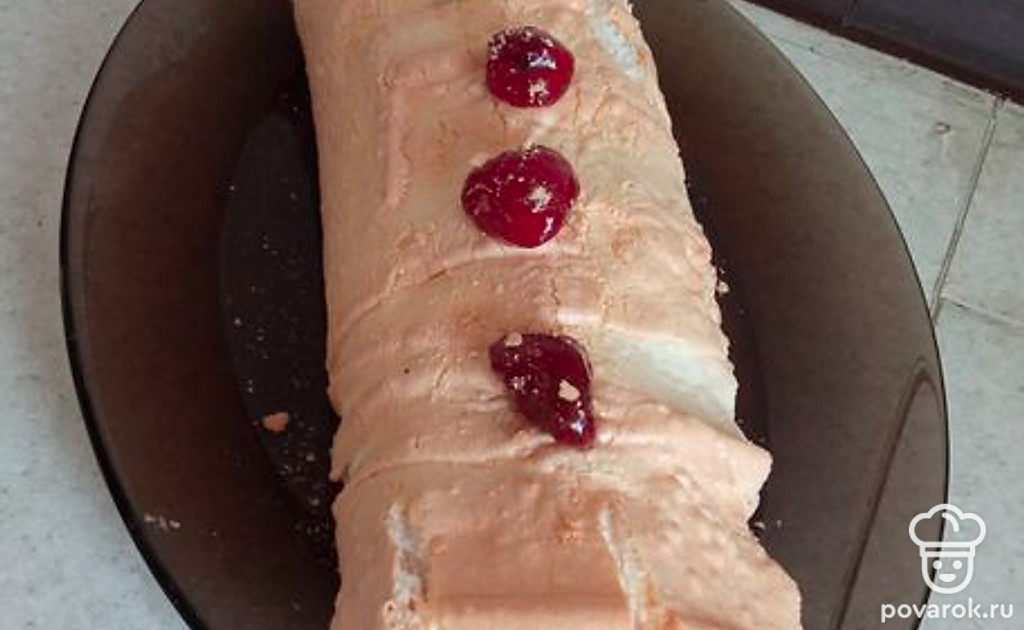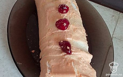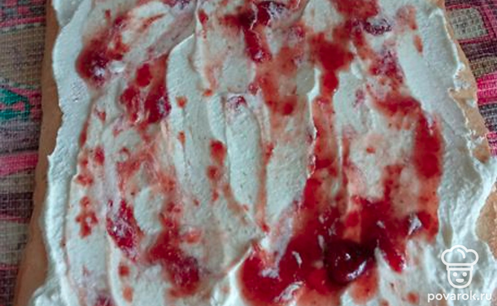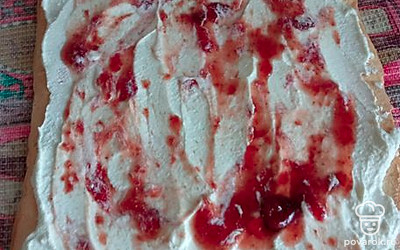 Сверху распределяем клубничное варенье и сворачиваем в рулет.