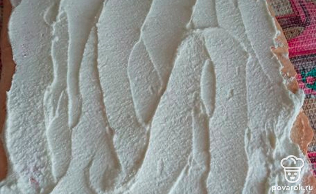 Взбиваем творог с молоком. Готовую меренгу переворачиваем, смазываем творожным кремом.