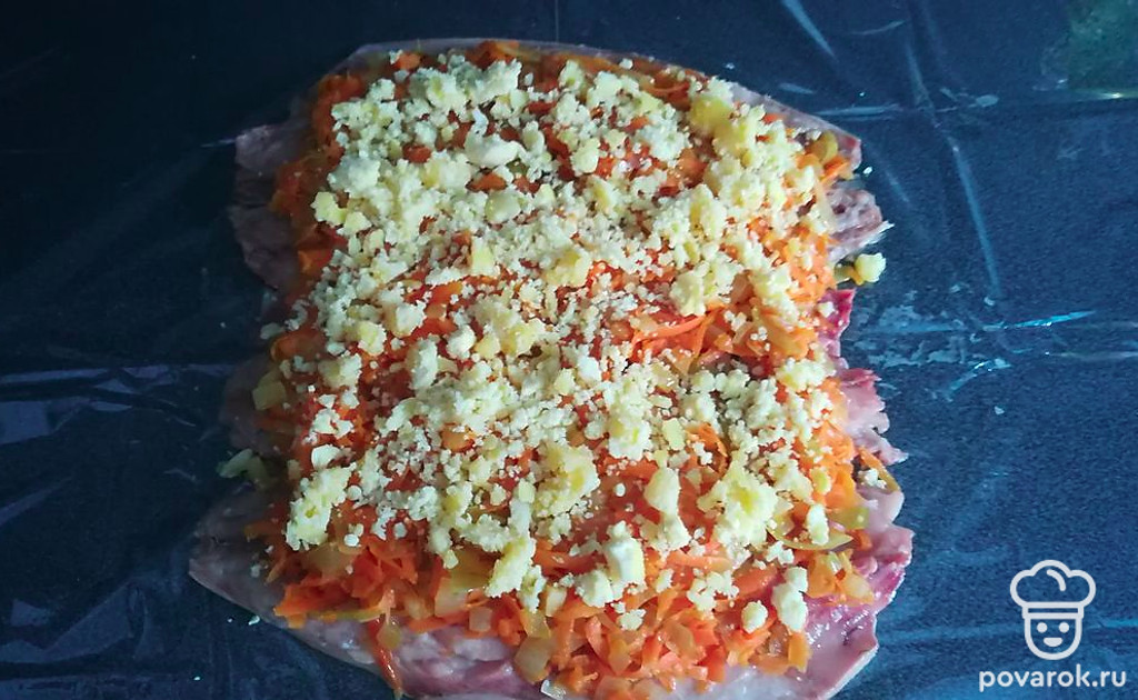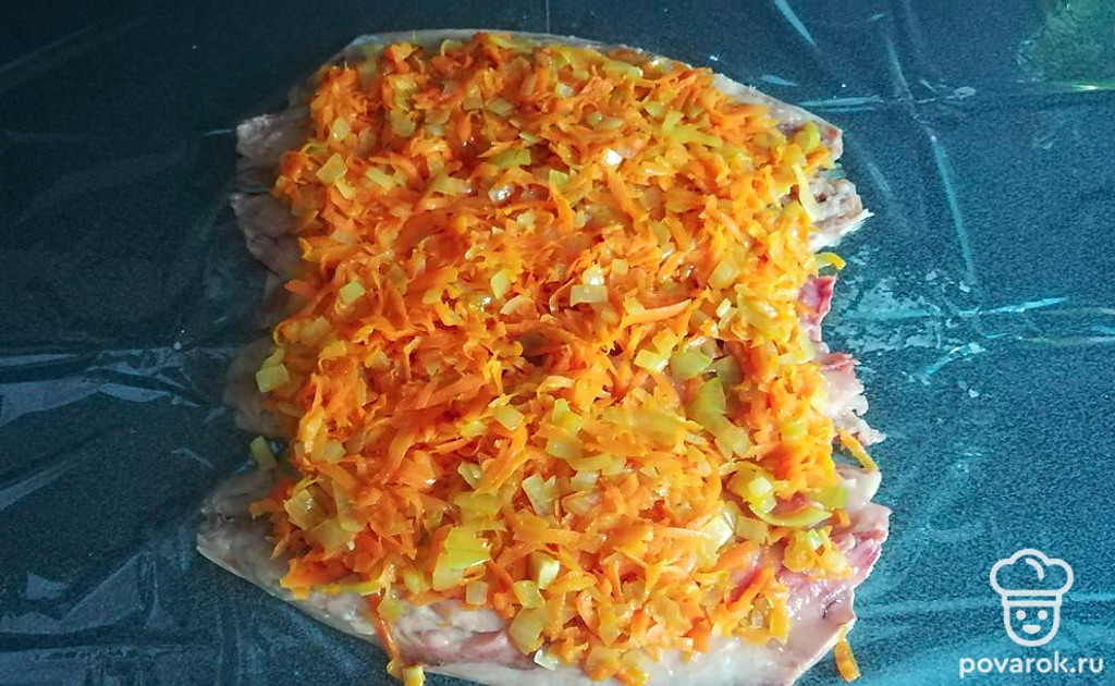 Посолить, завернуть рулетом и туго связать.